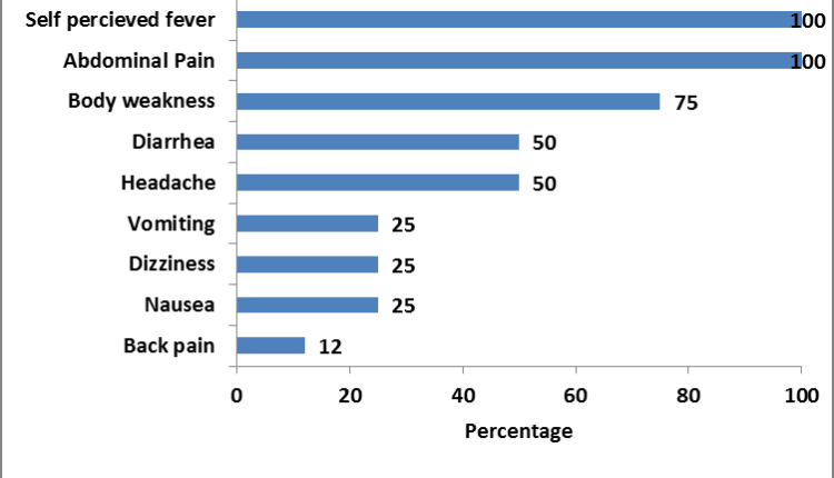All the case patients presented with abdominal pain and self-perceived fever. However, no fever was documented in any of the survivors on admission to hospital.