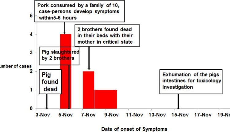 This was a localised cluster of deaths was due to unintentional chemical poisoning from consumption of a dead pig contaminated with carbamates and organophosphates. All the affected people ate the pork and developed symptoms and signs consistent with organophosphate and carbamate poisoning soon afterwards.