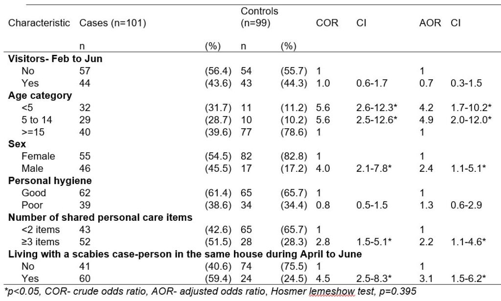 The case-control study had 101 cases and 99 controls. Among the cases, 40 (39.6%) and compared to 77(78.6%) of controls were 15 years or older. In multivariable analysis, being aged <5 years (OR=4.2, 95%CI: 1.7-10) and 5 to 14 years (AOR=4.9, 95%CI: 2.0-12), having shared four personal items compared to two (AOR=8.9, 95%CI: 2.2-36.2), being male (AOR=2.4, 95%CI: 1.1-5.1), and having a previous scabies diagnosis (AOR=3.1, 95%CI: 1.5-6.2) were associated with case-status (Table 3).