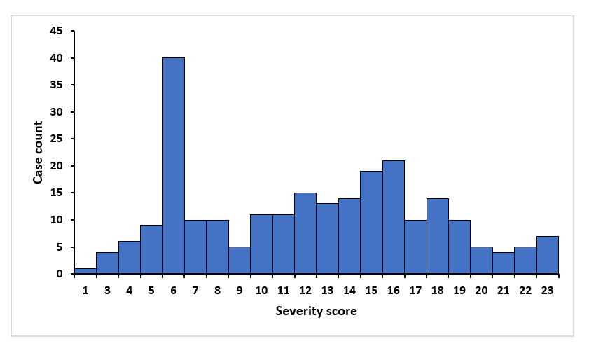 The majority of the cases were severe, 75% (184/224). The median severity score was 12.5 with a range of 1-23 with right-sided skewness (Figure 1). Out of the 224 cases, 6.8% of the cases died (14/224) (Table 1). Among these deaths, 71% (10/14) of them had comorbidities and 50% (7/14) scored 23/23 using the MPSSS tool. Of the 10 who had comorbidities, 9 had HIV infection and the other had sickle cell anemia. Among the deaths, most 43% (6/14) were aged 30-45years, followed by <5years of age who contributed 21% (3/14), 15-30 years of age contributed 14% (2/14), 45-60years of age contributed 14% (2/14), and 5-15 years of age contributed 1% (1/14).