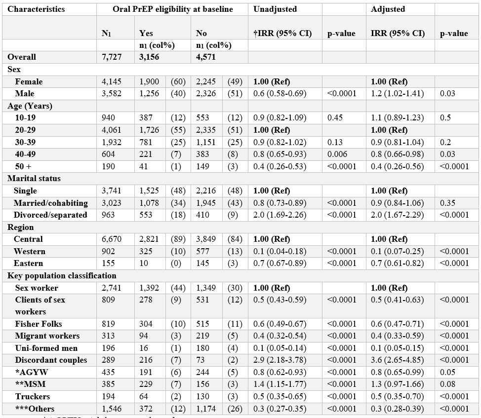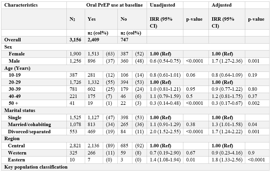 Results: Overall, 7,727 HRPs were screened for oral PrEP eligibility. Out of these, 3,156 (41%) were identified oral PrEP-eligible for whom 1,900 (60%) were female and 1,392 (44%) were sex workers. Among HRPs identified as oral PrEP-eligible, 2,409 (76%) were initiated on oral PrEP. Of these, 1,513 (63%) were female, 2,136 (89%) were from Central Region, and 1,188 (49%) were sex workers. Being a male (vs. female) HRPs was associated with increased oral PrEP eligibility (IRR=1.2, 95% CI: 1.02-1.41; p=0.03). HRPs in discordant relationship (vs. sex workers) were strongly associated with increased oral PrEP eligibility (IRR=3.6, 95% CI: 2.65-4.85; p<0.0001). Being married or cohabiting (vs. single) was associated with increased oral PrEP use (IRR=1.3, 95% CI: 1.01-1.6; p=0.04). Older HRPs aged 50 years and above had a reduced rate of oral PrEP eligibility (RR=0.4, 95%CI: 0.26-0.56; P<0.0001) and oral PrEP use (RR=0.3, 95%CI: 0.17-0.67; P=0.002).
