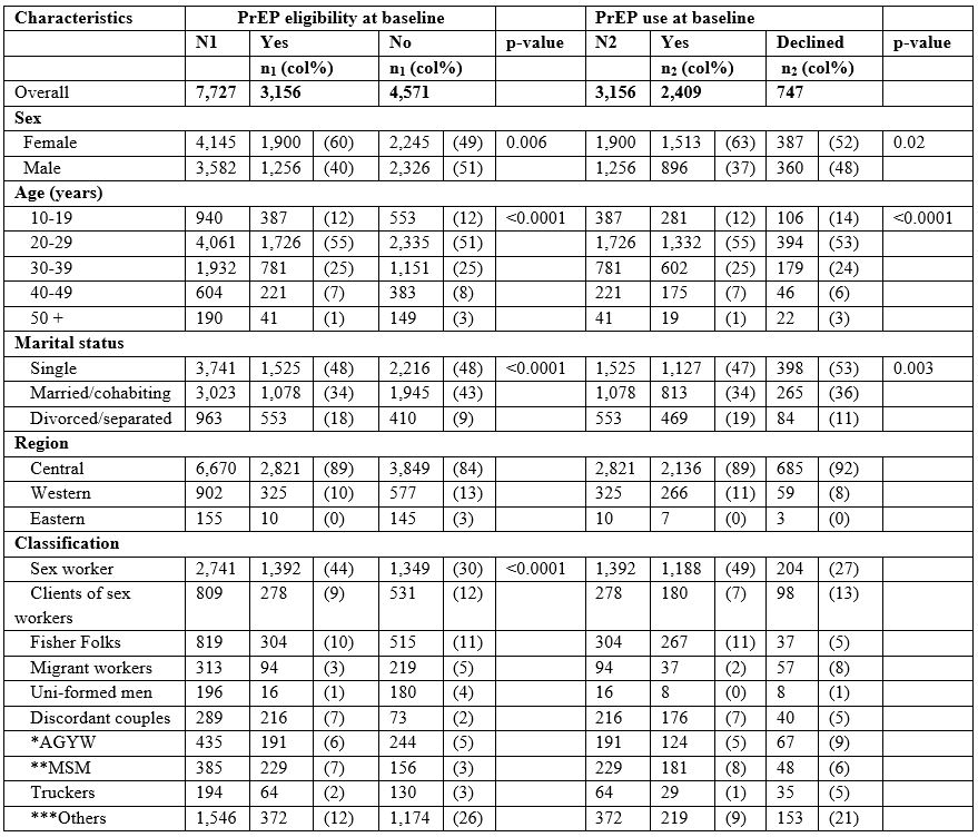 Table 1: Socio-demographic characteristics of high-risk populations screened for oral PrEP eligibility and oral PrEP use at baseline, Uganda, 2017-2021