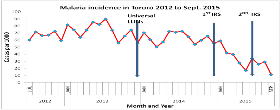 In December 2013, the Ministry of Health ( MOH) conducted universal distribution of Long lasting insecticide treated nets in the district giving one net per two people in every household. Tororo is among the 14 districts where the National Malaria Control Programme start- ed implementing IRS in December 2014. In this study we describe the magnitude of malaria in Tororo 2012-2015 and assess if there was a change in the disease incidence following universal distribution of LLINs to communities and introduction of IRS. Our findings in- form the district, National Malaria Control Program (NMCP) and partners on temporal change in clinical malaria burden following vector control interventions. We also demonstrate use of routine surveillance data in assessing malaria control interventions.