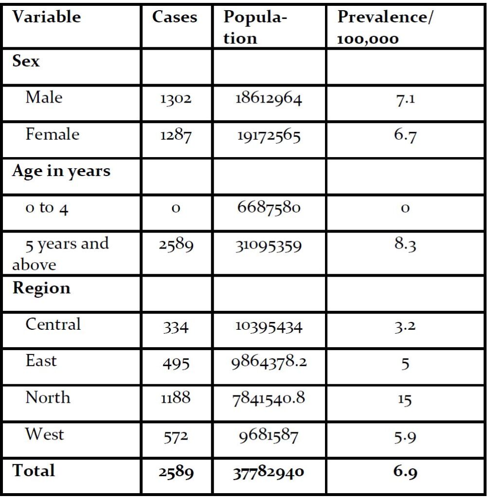 The overall prevalence of attempted suicide during the study period was 6.9/100,000. Males (7.1/100,000) were more affected than females (6.7/100,000). Persons aged ≥ 5years were the only affected (8.3/100,000). Northern region (15/100,000) had the highest prevalence of attempted suicide compared to other region (Table 1 and Figure 1). The overall case fatality rate (CFR) was 28% (72/2589). The CFR was higher among males (50/1302=3.8%) compared to females (22/1287=17%).