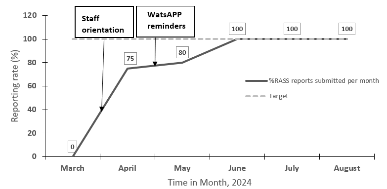 Results: Baseline reporting was 0% in March 2024, due to lack of staff orientation. Orientation of two RASS users in April increased reporting to 80% by May, and with WhatsApp reminders in June, it reached 100% and was sustained through August.