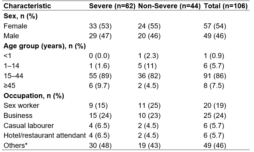 onset), and 20 (19%) were sex workers. Of the 106 suspected cases, 62 (59%) presented with severe