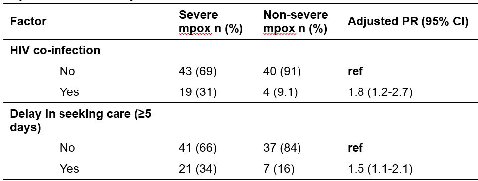 Individuals with HIV co-infection had an 80% higher prevalence of severe mpox compared to those without HIV. Also to note, delaying care by 5 or more days was associated with a 50% higher prevalence of severe mpox compared to those who sought care earlier.