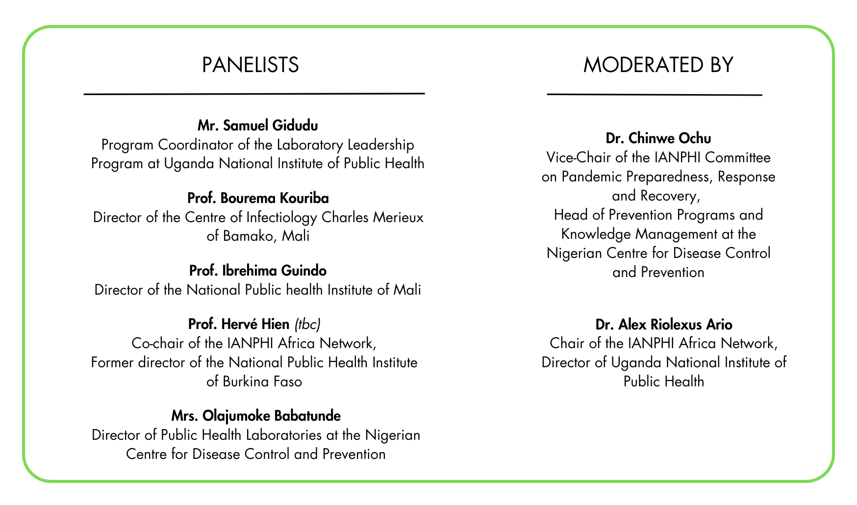 The webinar will explore the pivotal role of laboratory leadership programs in enhancing early detection and rapid response to outbreaks, in particular in Africa. Our distinguished speakers will delve into the impactful contributions of the Uganda Public Health Fellowship Program-Laboratory Leadership Program (PHFP-LLP) in strengthening outbreak responses. Additionally, we will discuss the implementation and experiences of the Global Laboratory Leadership Program (GLLP) by CICM-Mali, and the crucial aspects of leadership and coordination within Mali’s laboratory network during epidemic management. Finally, we will also learn from the experience of Nigeria and Burkina Faso.
