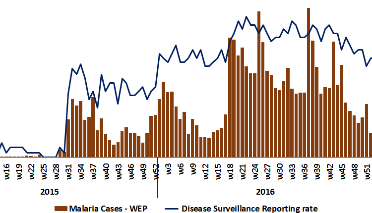 During the year 2015, Pader district reported low Malaria cases because only about 10% of the HFs had reported, this implies that a lot of malaria cases were missed out during that period. However, after massive scale up of mTrac and IDSR training by the Ministry of Health, the district improved its reporting rates to about 70% between from weeks 31 of 2015 to week 21 of the year 2016 hence detecting most of malaria outbreaks (Figure3).