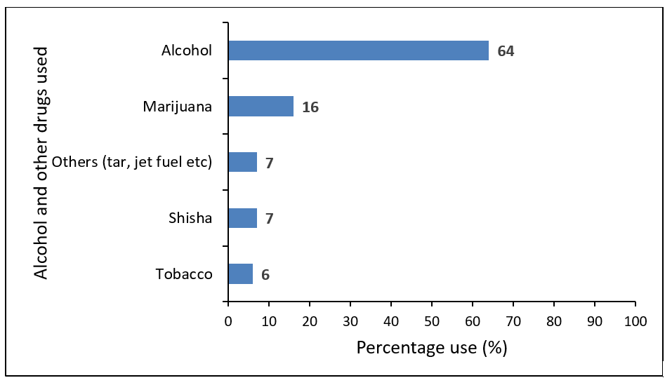 Among students who had reported ever using AODs (155), alcohol was the most ever used substance, 99 (64%) followed by marijuana 25 (16%) while the least used substance was tobacco 9 (6%) (Figure 2).