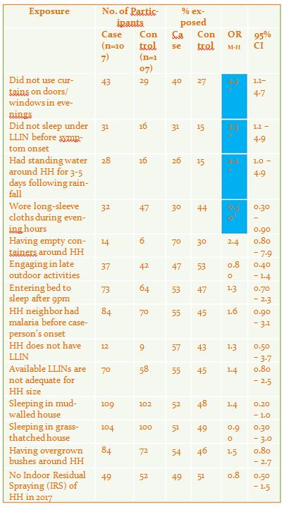 The epidemic curve showed a propagated outbreak beginning in late March after start of heavy rains. 29% (31/107) of case-persons and 15% (16/107) of controls were not sleeping under a Long Lasting Insecticide-treated Net (OR=2.3,95%CI=1.1-4.9); 40% (43/107) of case-persons and 27% (29/107) of controls did not use curtains on doors and windows during evenings (OR=2.3, 95%CI=1.1-4.7); 26% (28/107) of case-persons and 16% (16/107) of controls had standing water around households for 3-5 days following rainfall (OR=2.2, 95%CI=1.0-4.9). 30% (32/107) of case-persons compared with 44% (47/107) of controls wore long-sleeve cloths during evening hours (OR=0.54, 95% CI=0.30-0.96).