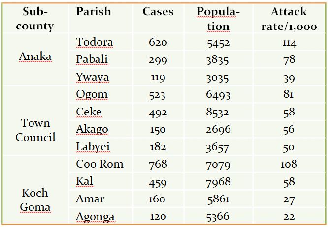 Among parishes, Todora parish in Anaka Sub-county had the highest attack rate (114/1,000), followed by Coo Rom parish (AR=108/1,000) in Koch Goma Sub-county and Ogom Parish (81/1,000) in Town Council.