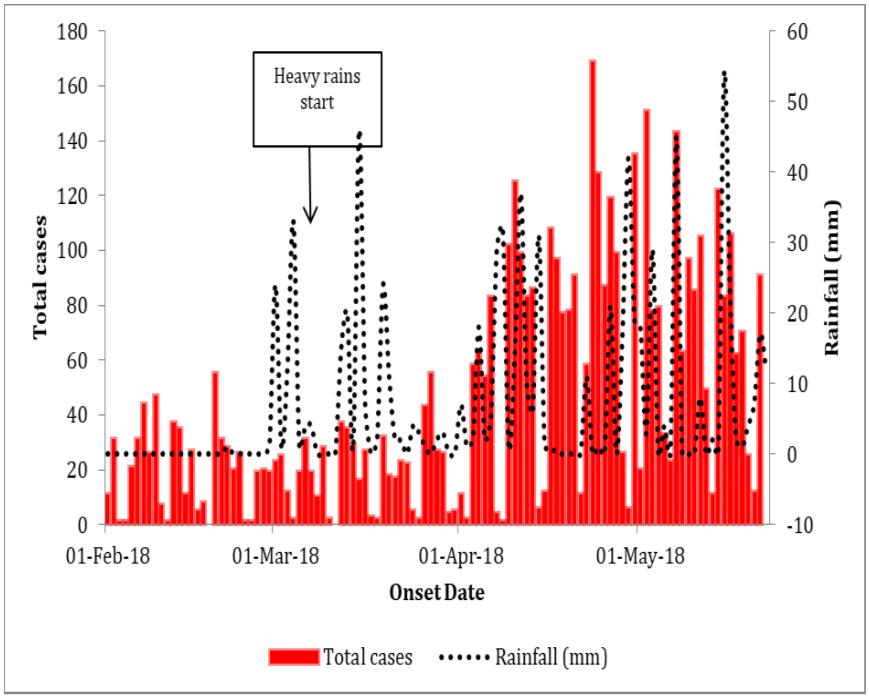 The epidemic curve is propagated and shows an increase in malaria cases from late March. The upsurge occurred about 4 weeks after the first rains occurred