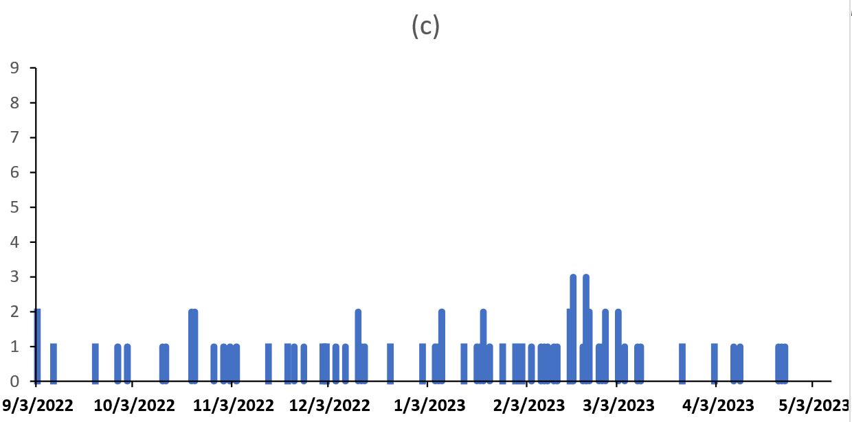Figure 2: Date of rash onset among measles case-patients August, 2022 – November, 2023. a) district epidemic curve, b) epidemic curve for Refugees, and c) epidemic curve for Nationals |
