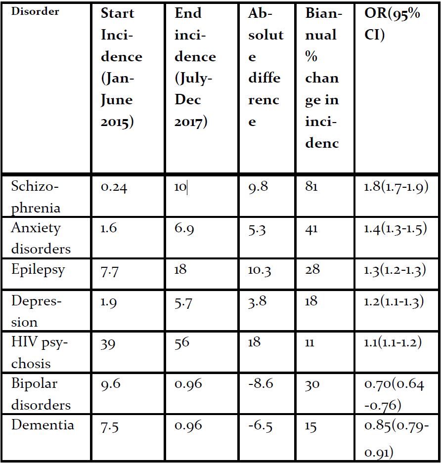 Over the entire study period, we identified 4053 mental illness cases. The average increase in incidence over the three years was 461/1000 prisoners. For every additional six months from 2015-2017, the biannual percentage change in incidence was: Schizophrenia (OR=1.8, 95% CI=1.7-1.9), Anxiety Disorders ( OR=1.4, 95% CI=1.3-1.5), Epilepsy (OR=1.3, 95% CI=1.2-1.3), Depression (OR=1.2, 95% CI=1.1-1.3), HIV Related Psycho-sis ( OR=1.1, 95% CI=1.1-1.2), Bipolar disorders (OR=0.7, 95% CI=0.64-0.76), Dementia (OR=0.85, 95% CI=0.79-0.91).