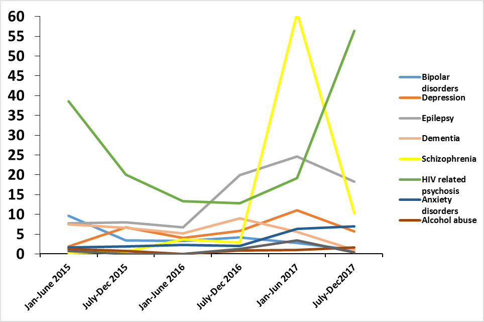 From July 2016 to December 2017, there was a noticeable in-crease in incidence of HIV Related Psychosis among prisoners managed at Murchison Bay Hospital (Jul-Dec 2016 = 13/1000 and Jul-Dec 2017 = 56/1000). During January to July 2017, there was a sharp increase in Incidence of Schizophrenia among prisoners (61/1000). In addition, there was an increase in Epilepsy among prisoners from 7.7/1000 in Jan-Jun 2015 to 18/1000 during Jul-Dec 2017. The incidence in dementia among prisoners decreased from 7.5/1000 during Jan-Jun 2015 to 0.96/1000 in Jul-Dec 2017. (Figure 1).