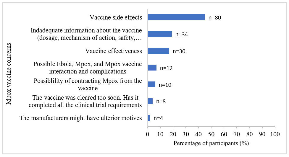 When asked if they had any concerns about the mpox vaccine, 178 (42%) of the study participants expressed concerns about the mpox vaccine. The participants were concerned about possible side effects from the vaccine 80(45%), the fact that they had not receive enough information about the mpox vaccine 34(19%), vaccine effectiveness 30(17%), and possible interaction between the vaccine, mpox infection, and Ebola infection 12(7%) as there was an Ebola outbreak at the time, the speed at which the vaccine was cleared for use 8(4%), and the fact that the government might have had ulterior motives for vaccinating the population 4(2%) (Figure 1).