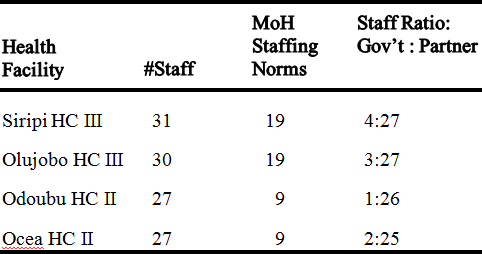 All Health Centres are well staffed above the MoH recommended standard. However, majority of the staff are not supported by Government of Uganda.