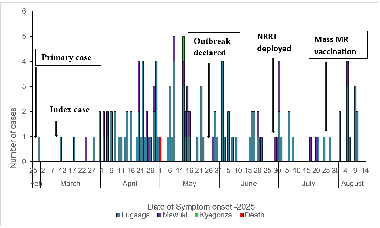 The measles outbreak in Kabulasoke Subcounty in 2025 was imported in late February by a primary case returning from Rakai district. It became a propagated outbreak with amplification among school-aged children and their households. Community awareness triggered detection in April, followed by laboratory confirmation on May 13 and a formal declaration by the Ministry of Health on May 27. The subsequent control measures, including the deployment of the National Rapid Response Team and a supplementary immunization campaign achieving 72% coverage, successfully interrupted transmission by August 30, 2025.