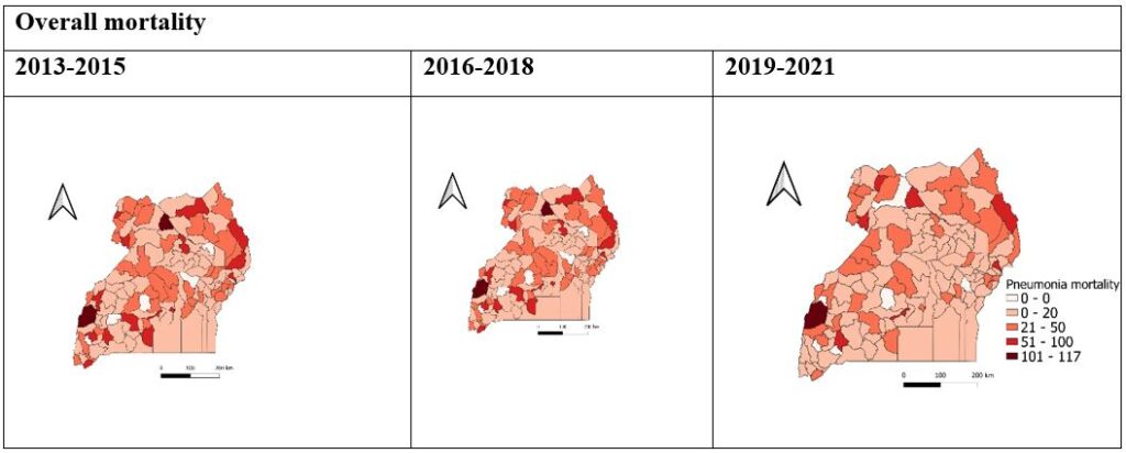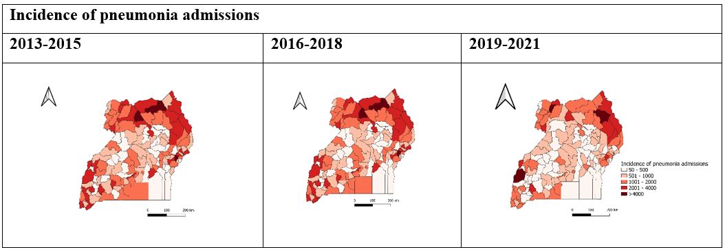 Spatial distribution of incidence of pneumonia admissions and overall mortality among children under 5 years, Uganda, 2013-2021