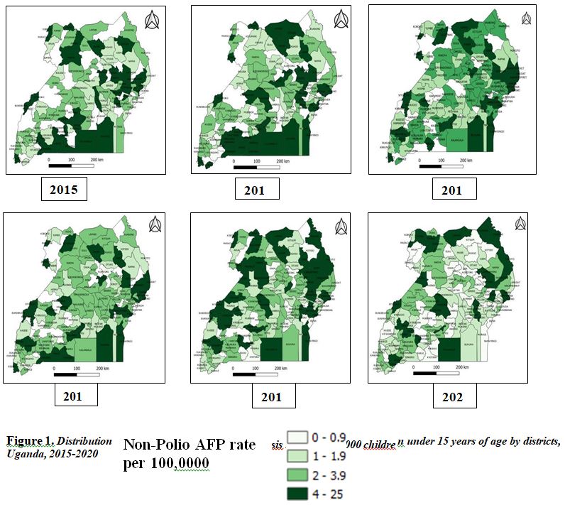 We conducted a retrospective descriptive quantitative study using AFP surveillance secondary data submitted to ministry of health and WHO, Uganda office by districts using case-based reporting from 2015 to 2020.