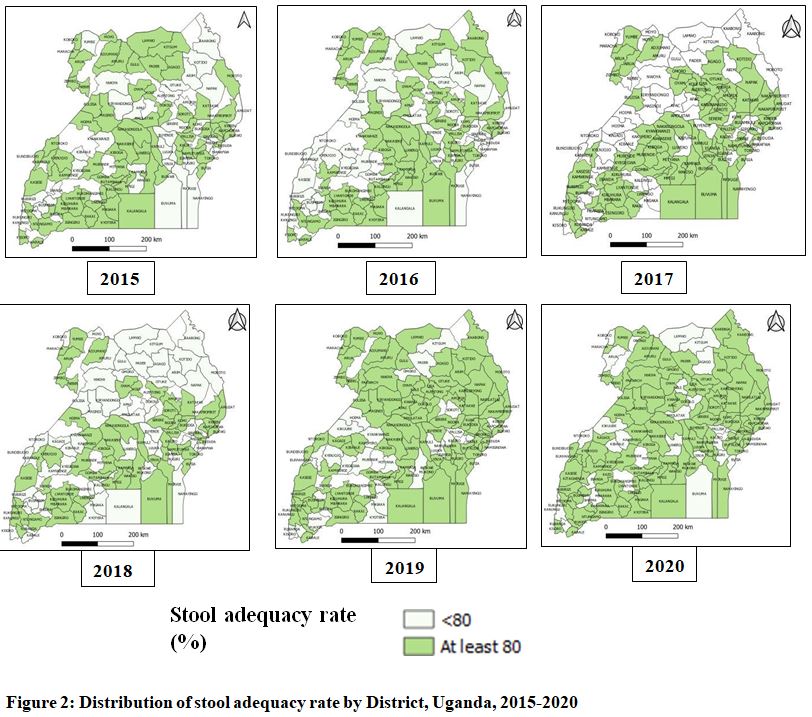 In Uganda, the stool adequacy rate has generally increased from 88% in 2015 to 91% in 2020 (Table 4). The mean stool adequacy rate in the study period was 88%. Throughout the study period, majority of the districts achieved the stool adequacy target rate of at least 80% (Table 4).
