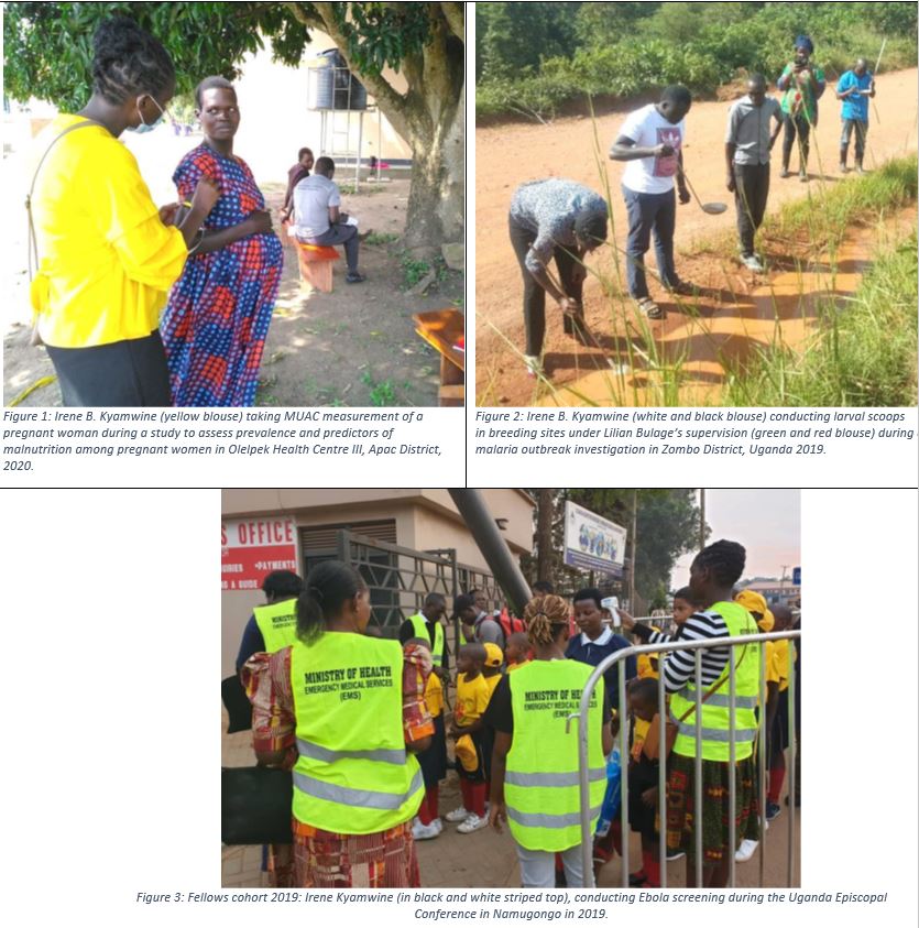 | ABOUT THE FELLOWDr. Irene B. Kyamwine a Field epidemiologist with a background in Medicine. I hold a Master of Public Health from Université Libre de Bruxelles, school of public health. During my time as a public health fellow, I have been attached to the Nutrition Division, Ministry of Health. I have developed confidence in myself and learnt to work in a dynamic environment. I have conceptualized, designed and implemented projects like the “Patterns of malnutrition among pregnant women in Apac District, Uganda”. These have built my confidence and competence in designing research protocols and implementing them. I have led two outbreak investigations and participated in 4 others. I have also, been part of the COVID 19 response and control activities. These have developed my competences in responding to emergences and working in a fast-paced environment. Throughout this two year period, I have led and coordinated projects both at the fellowship program and my host site. This has improved my leadership, training and coordination skills. Undertaking these activities and a number of data analysis projects improved my skills in data analysis using statistical and spatial packages like STATA, EPI Info and QGIS.   Achievements at the Host Site | |