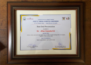 ABOUT THE FELLOWDr. Allan Komakech is a medical doctor, a public health specialist and now a qualified field epidemiologist. Before joining the fellowship, he pursued a medical degree in medicine and surgery (MBChB) from the University of Constantine, Algeria and Masters degree in Public Health (MPH) from Clarke International University, Kampala, Uganda. He is also currently pursuing a post graduate diploma in program planning and management. Prior to joining the fellowship, he served as a practicing medical doctor in both private and public facilities, a program coordinator for the viral hepatitis program at Lugei foundation and also as a lecturer at the school of public health of Clarke International University. During the fellowship, he was attached to the Reproductive Health Department (RHD), Ministry of Health (MoH). Consequently, his time at the host site has helped to improve my understanding of maternal and child health issues as well as adolescent and school health. The fellowship has helped Allan gain skills in advanced outbreak detection and investigation (including during the recent Ebola outbreak), scientific writing, grant and proposal writing, grant management, and oral presentation. He also developed skills in data analysis using Epi info, STATA, R and QGIS. His leadership skills have greatly improved through the situations encountered during the two years that required me to be a leader. In addition to his competencies, Allan is respectful, honest, and culturally-tolerant. The fellowship has reinforced these values and qualities of being a team player, flexible and hardworking, qualities that will help him excel as a public health specialist and field epidemiologist. Dr. Allan Komakech won the best oral presentation award at the Uganda society for health scientists conference, 2022 on the abstract presented on “Adverse events following AstraZeneca COVID-19 vaccination in Uganda, March-April, 2021”. Achievements at the Host Site