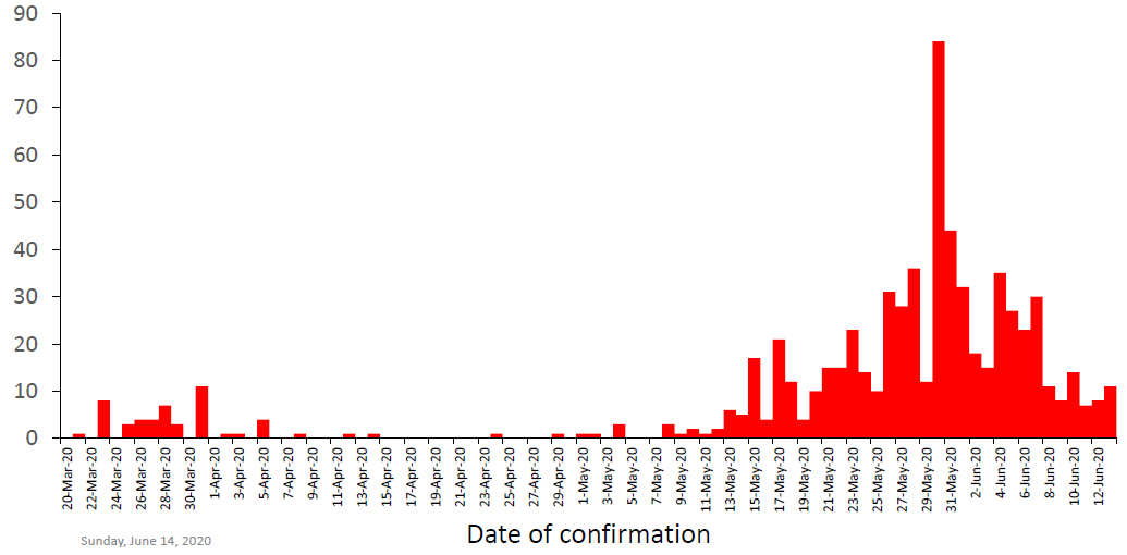 Figure 1: Curve of COVID-19 cases by date of confirmation, Uganda, 20 March-13 June 2020