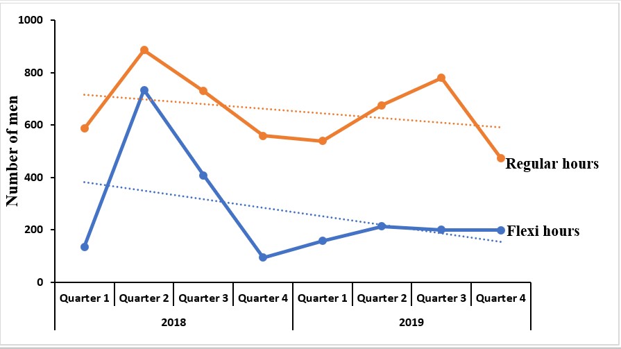 Overall, from 2018-2019, VMMC uptake during regular hours decreased by 6% while VMMC uptake during flexi-hours decreased by 30%. We observed an increase in the number of men who received VMMC service from the first quarter through the second quarter of 2018 during both regular and during flexi hours.